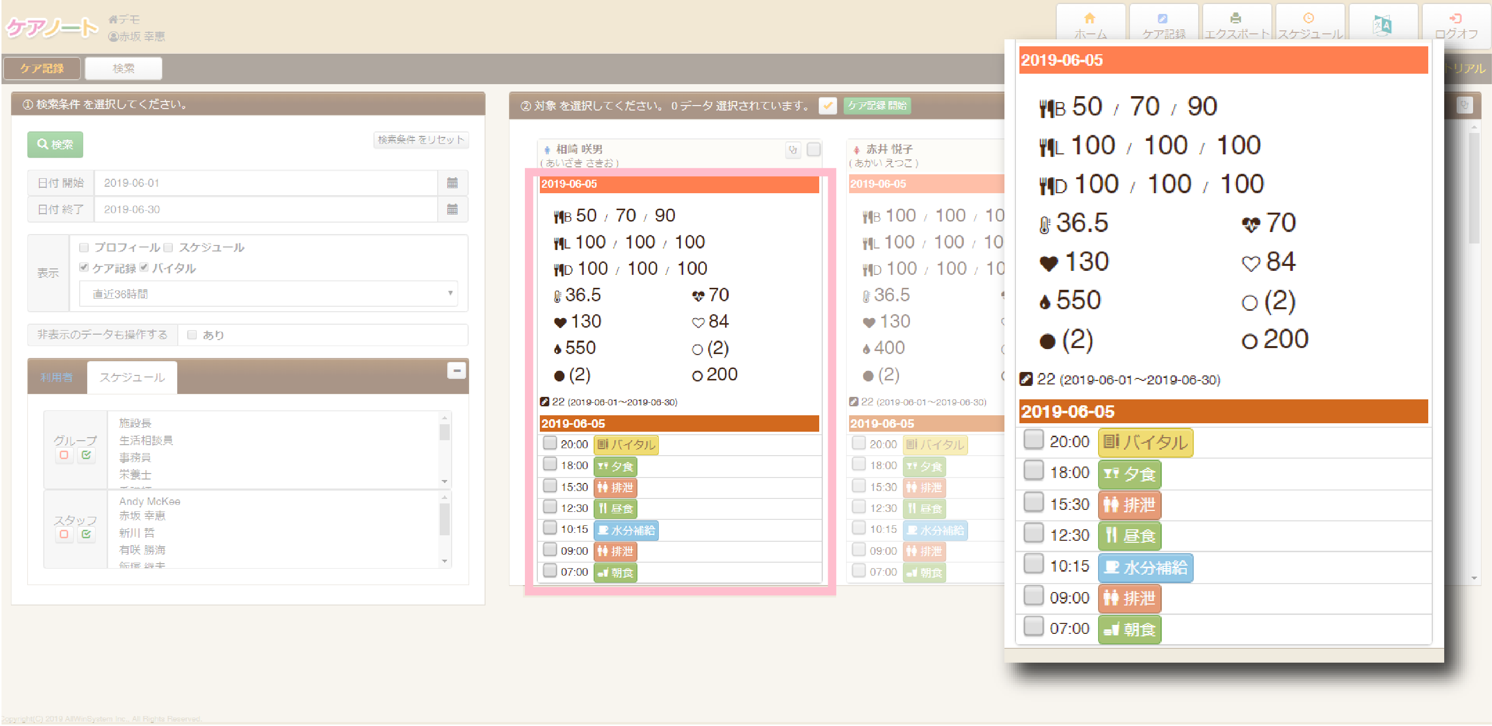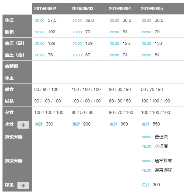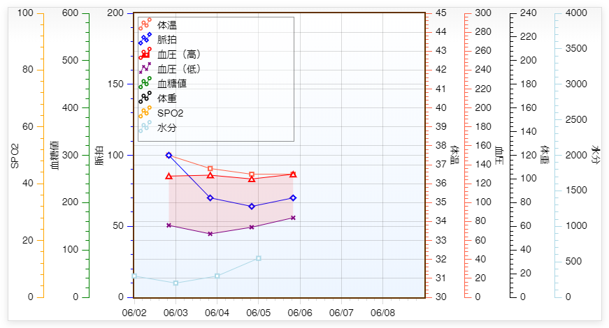 日頃のケアにおいて、血圧が高めな方、食事が十分にとれていない方、水分値が著しく低い方など、ひと目で確認することができ、病院やご家族に体調をご説明する際に、1週間の体調変化をグラフや一覧表で出力/提示できます。